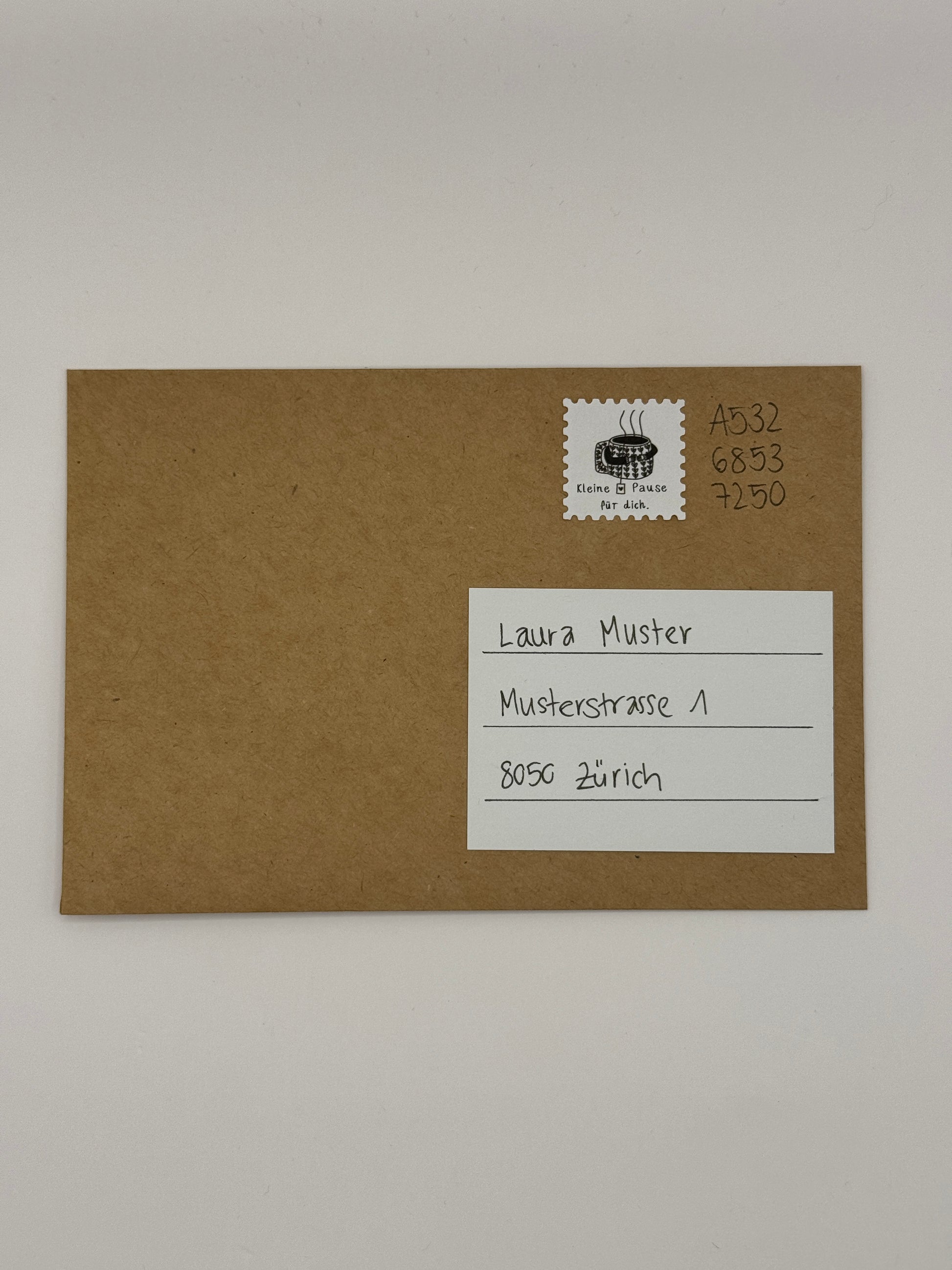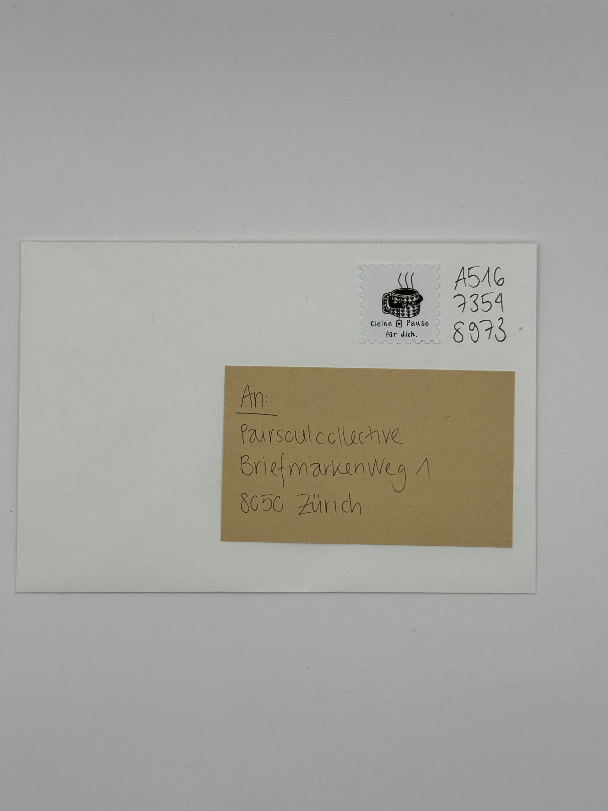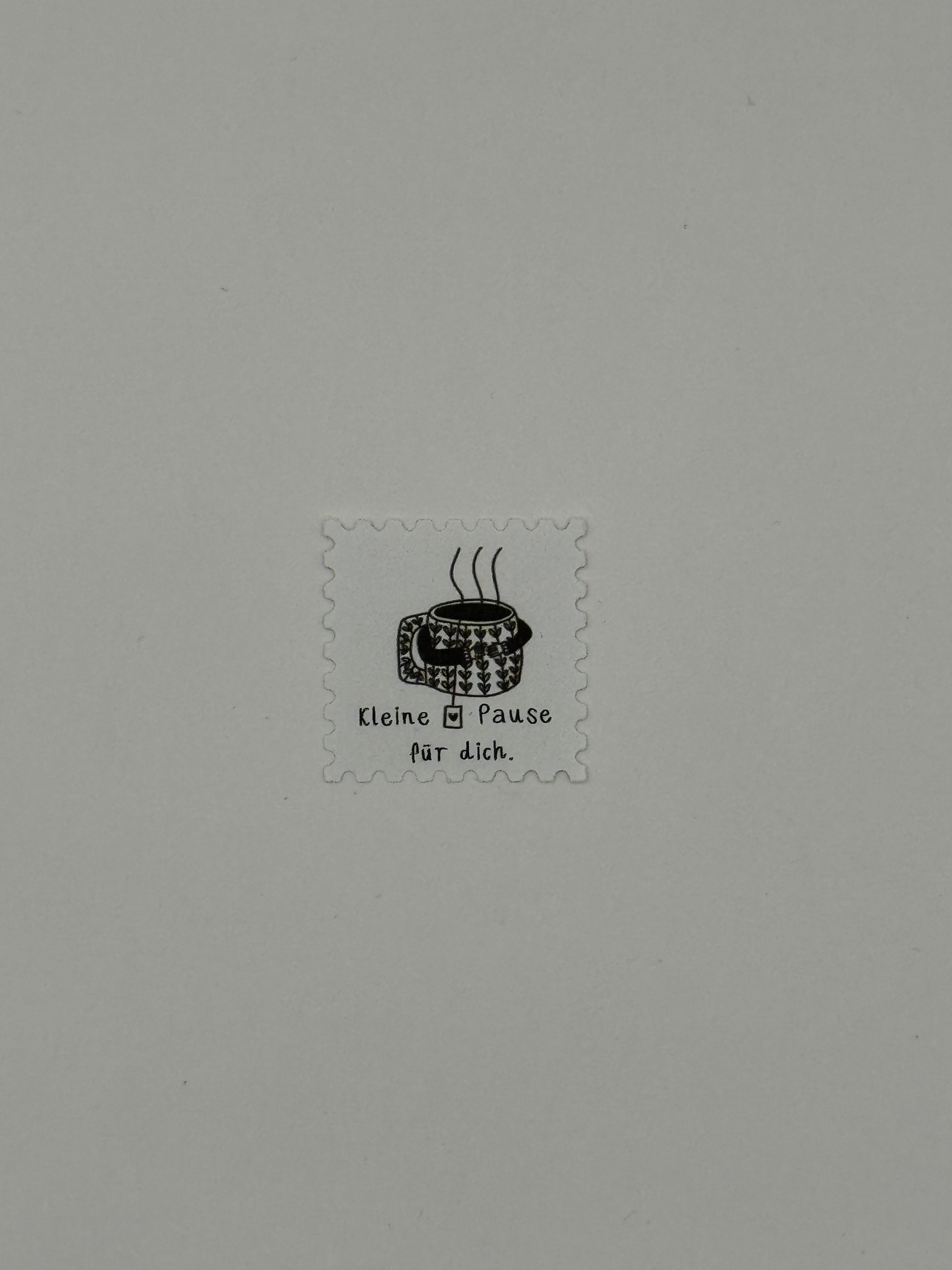 Briefmarken-Sticker mit Text „kleine Pause für dich“ und Ärme die eine Tasse umarmen.