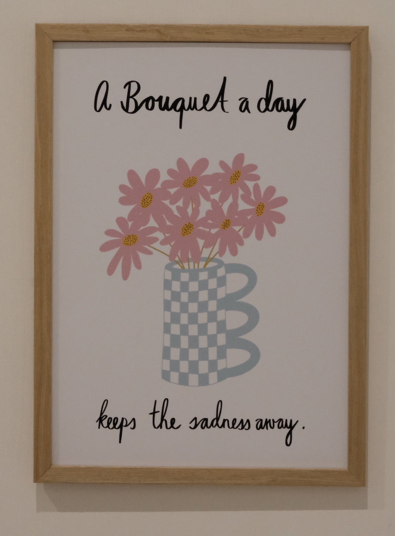 Ein bunter Blumenstrauss steht in einer charmanten, blau karierten Vase – ein echter Blickfang voller Leben und Farbe. Mir dem handgeschriebenen Spruch „A bouquet a day keeps the sadness away“. Der Spruch verleiht dem Motiv eine warme, tröstende Note. Das Poster strahlt Positivität, Trost und Alltagspoesie aus – ideal für Menschen, die Schönheit im Kleinen suchen.