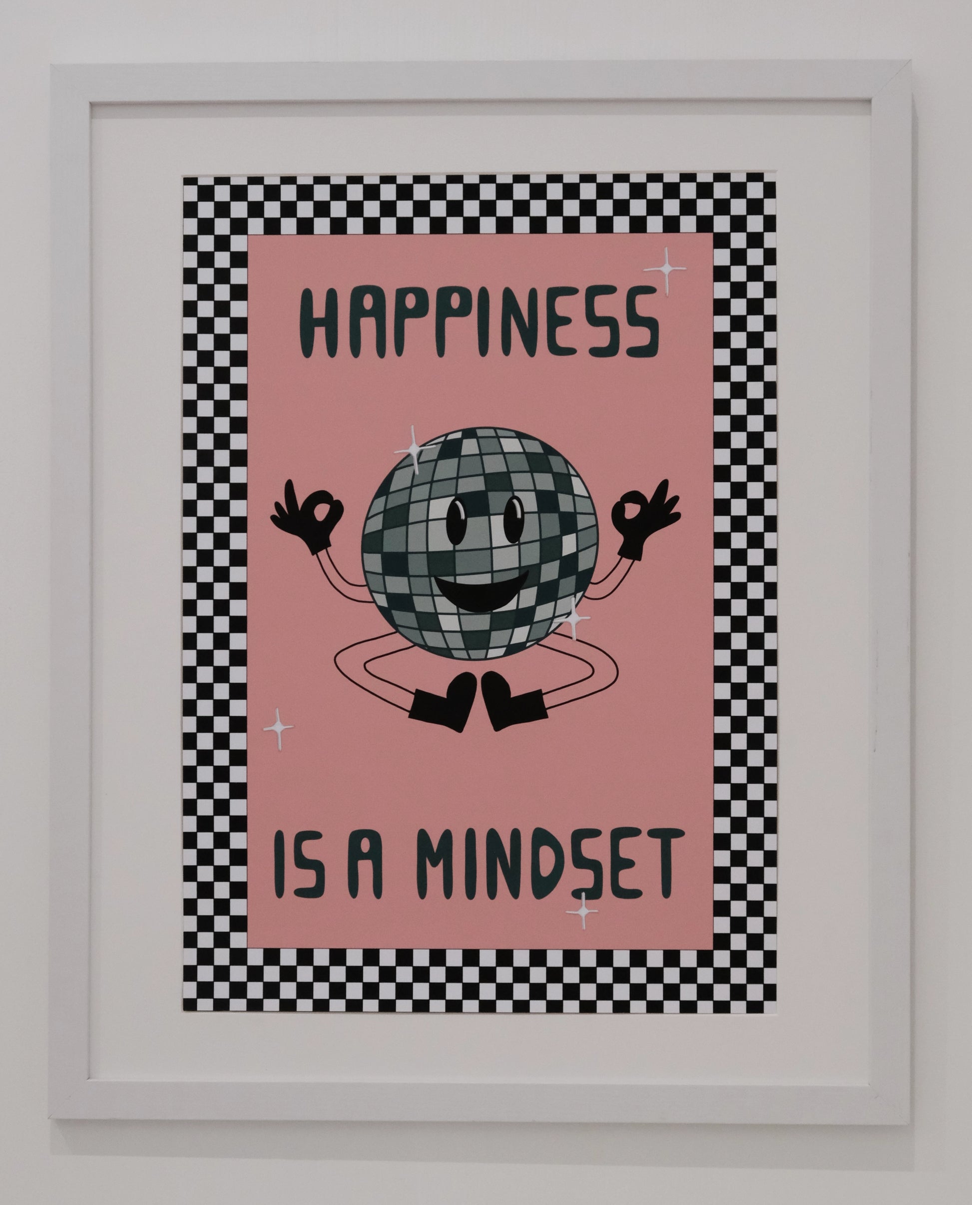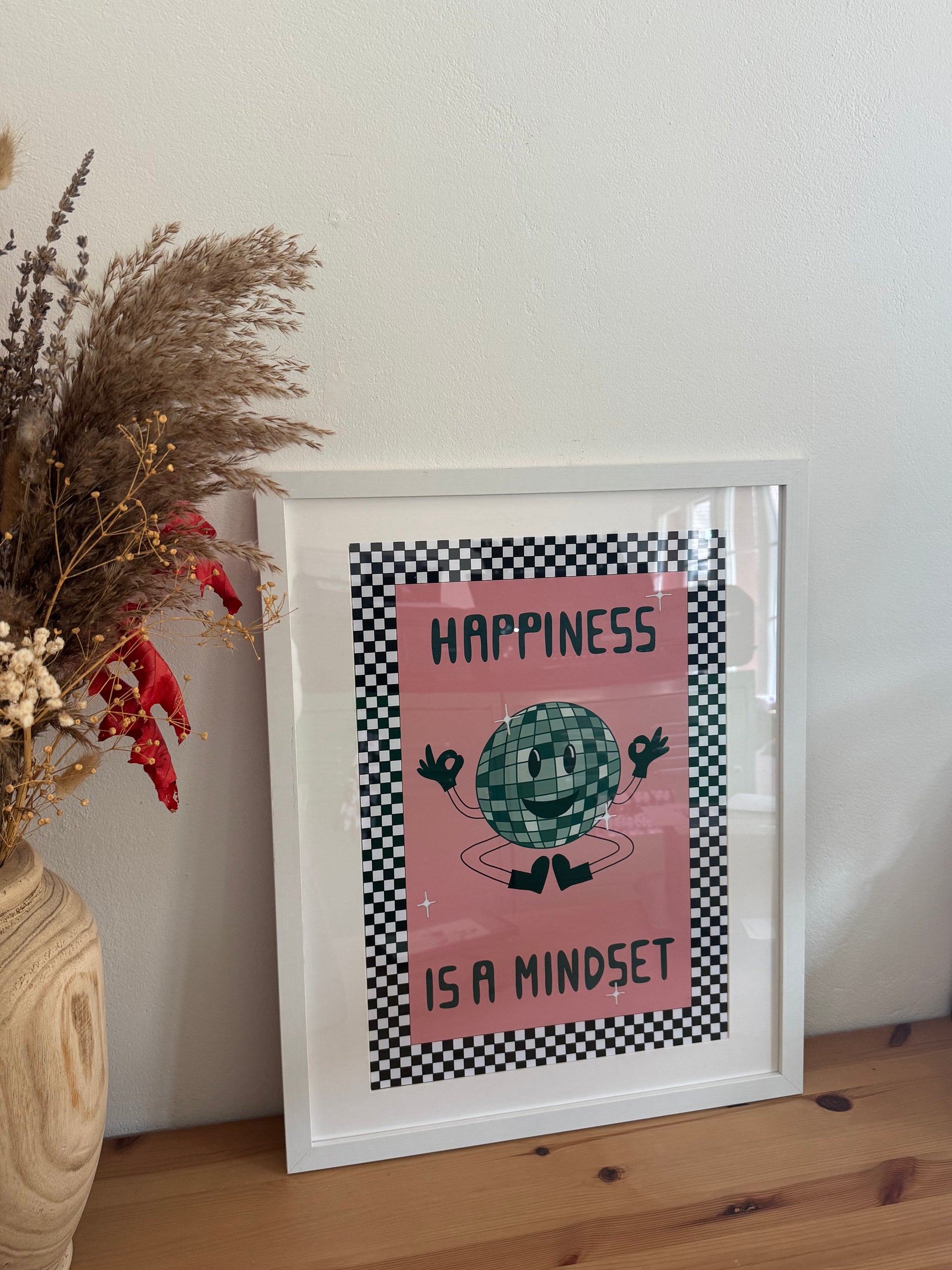 Dieses einzigartige Poster zeigt eine meditierende Disco-Kugel mit dem Spruch: „Happiness is a mindset“. Der Hintergrund erstrahlt in einem lebendigen Pink, während ein stilvoller, schwarz-weisser Karomuster-Rahmen das Design perfekt abrundet. Die Farben sind in frischen Dopamine-Tönen gehalten, die für positive Energie und gute Laune sorgen. Ein Hingucker für jedes Zimmer.